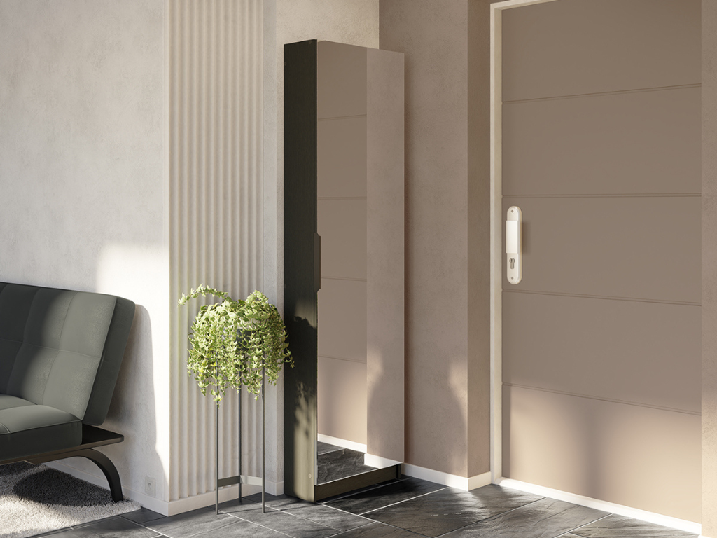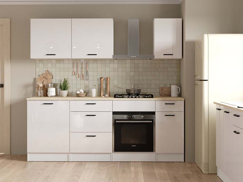 - Sem puxadores, as frentes projetam-se ligeiramente acima, servindo de puxador